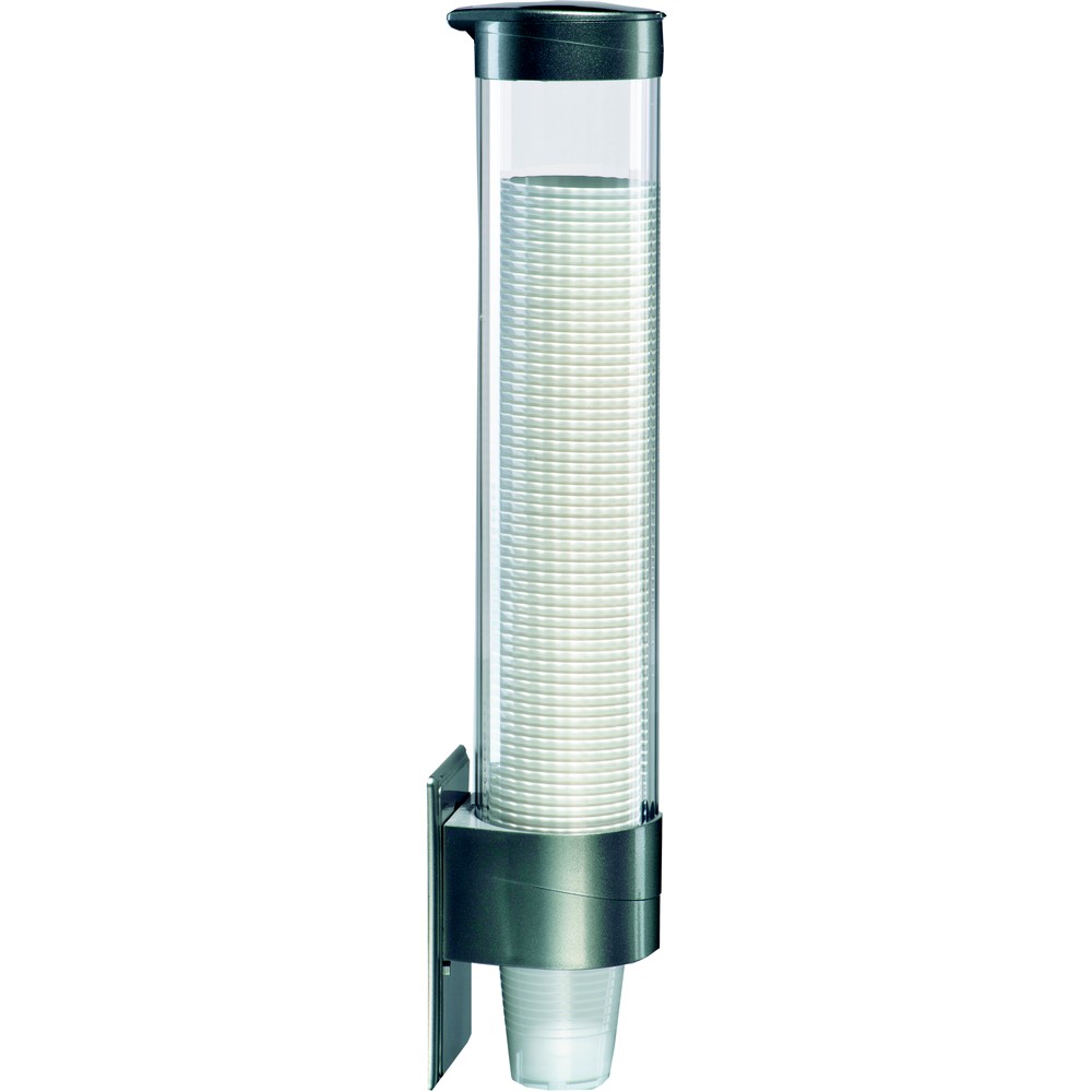 Ёмкость для стаканчиков изготовлена из прозрачного пластика, а крышка и крепёжная часть из пластика серебристого цвета.